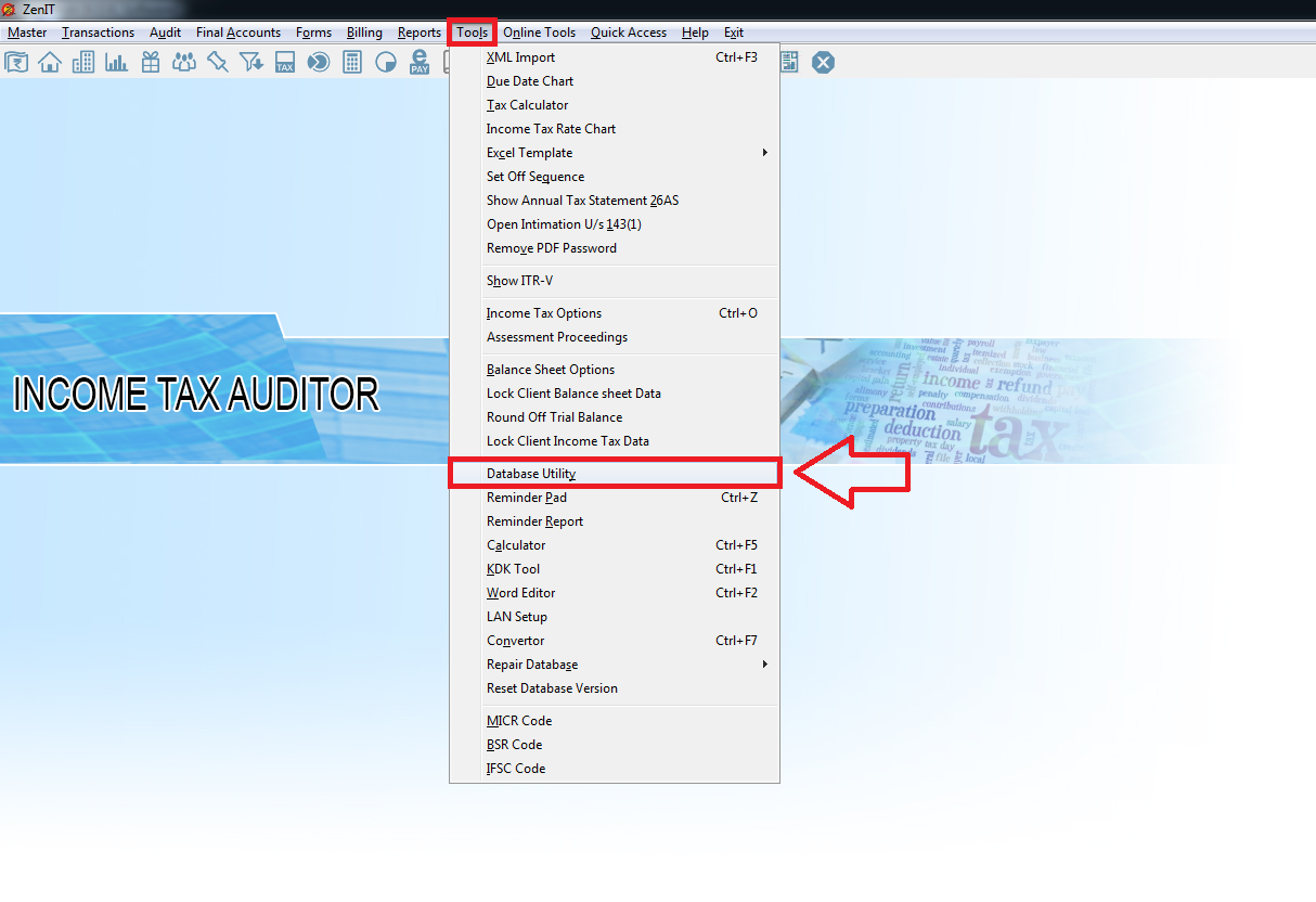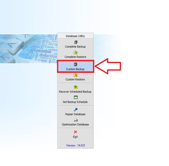 To take backup of any particular clients please open the spectrum module like Income Tax, TDS and then go to its Tools Menu >> Database Utility >> Custom backup.