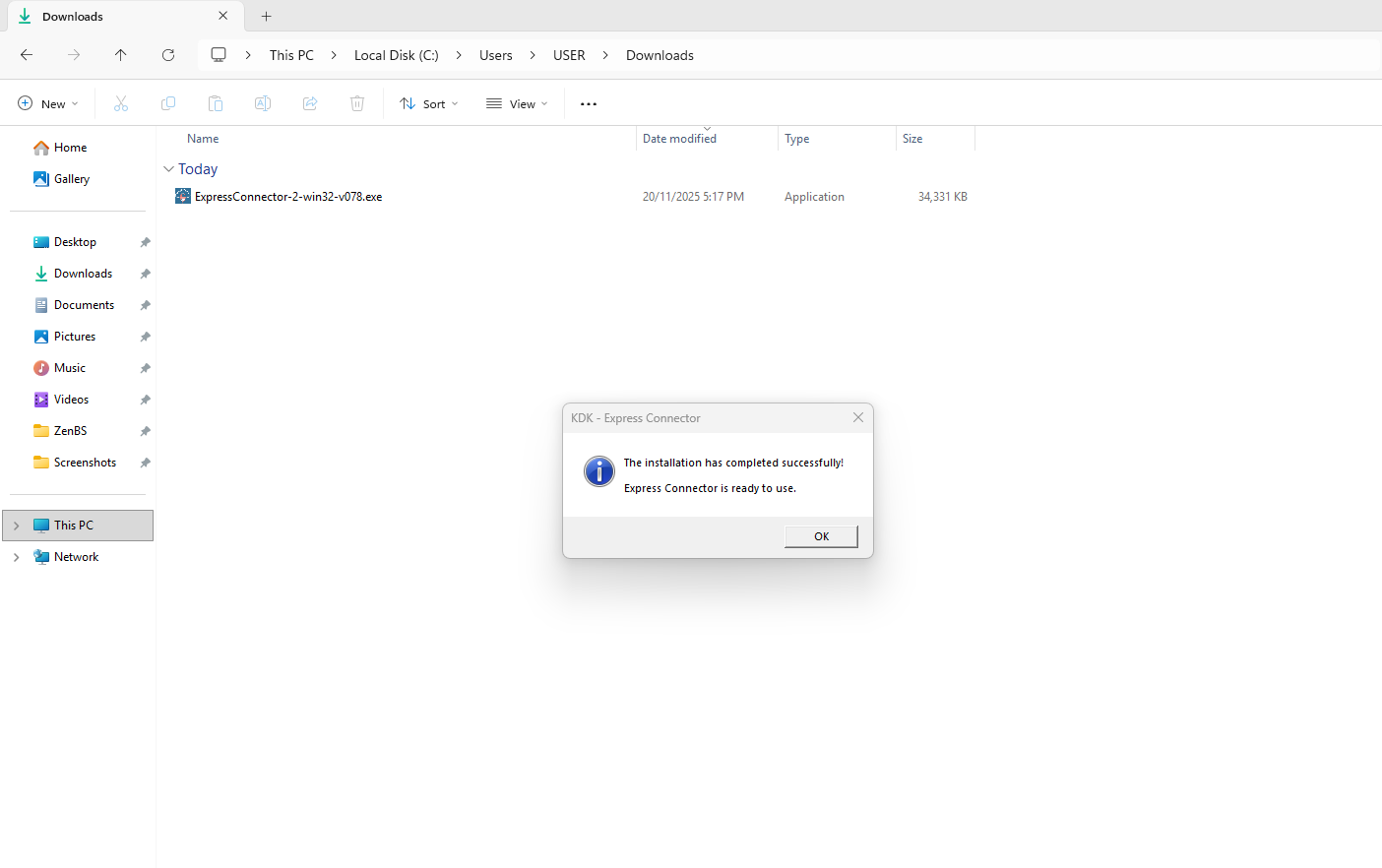 “The installation has completed successfully! Express Connector is ready to use.”