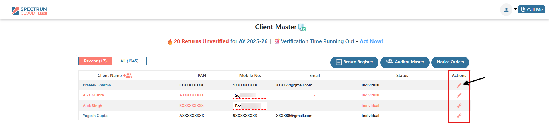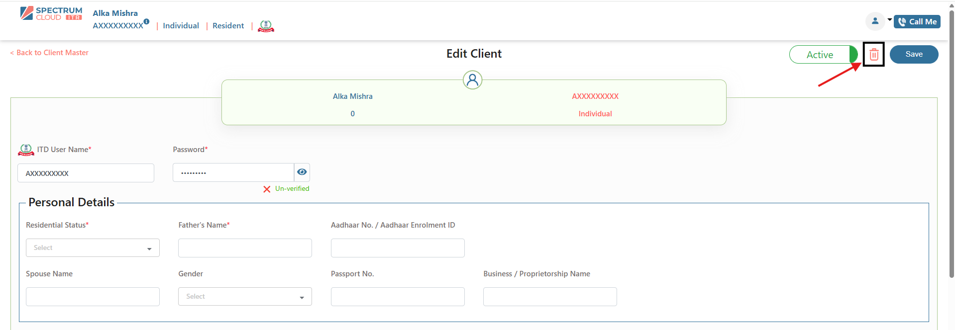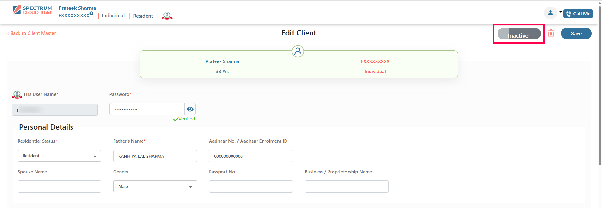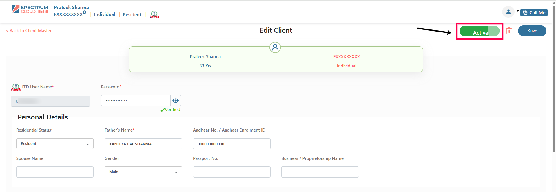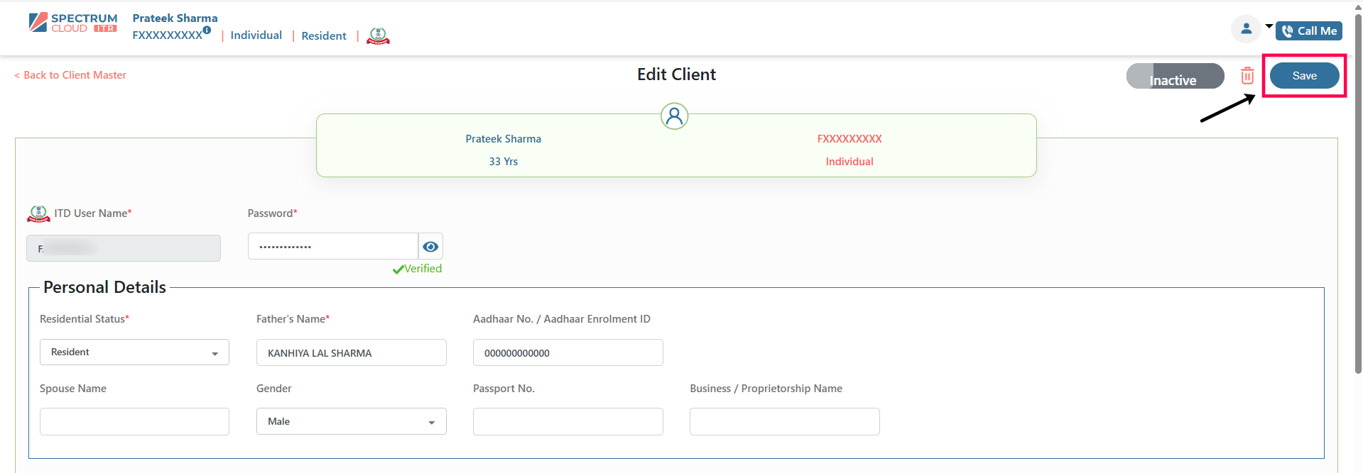 How to Edit Client Master ? Note: The Assessee Name and Date of Birth (DOB) cannot be manually changed. These details are automatically updated from the Income Tax Portal. If you have updated the Assessee Name or DOB on the portal and want the ...