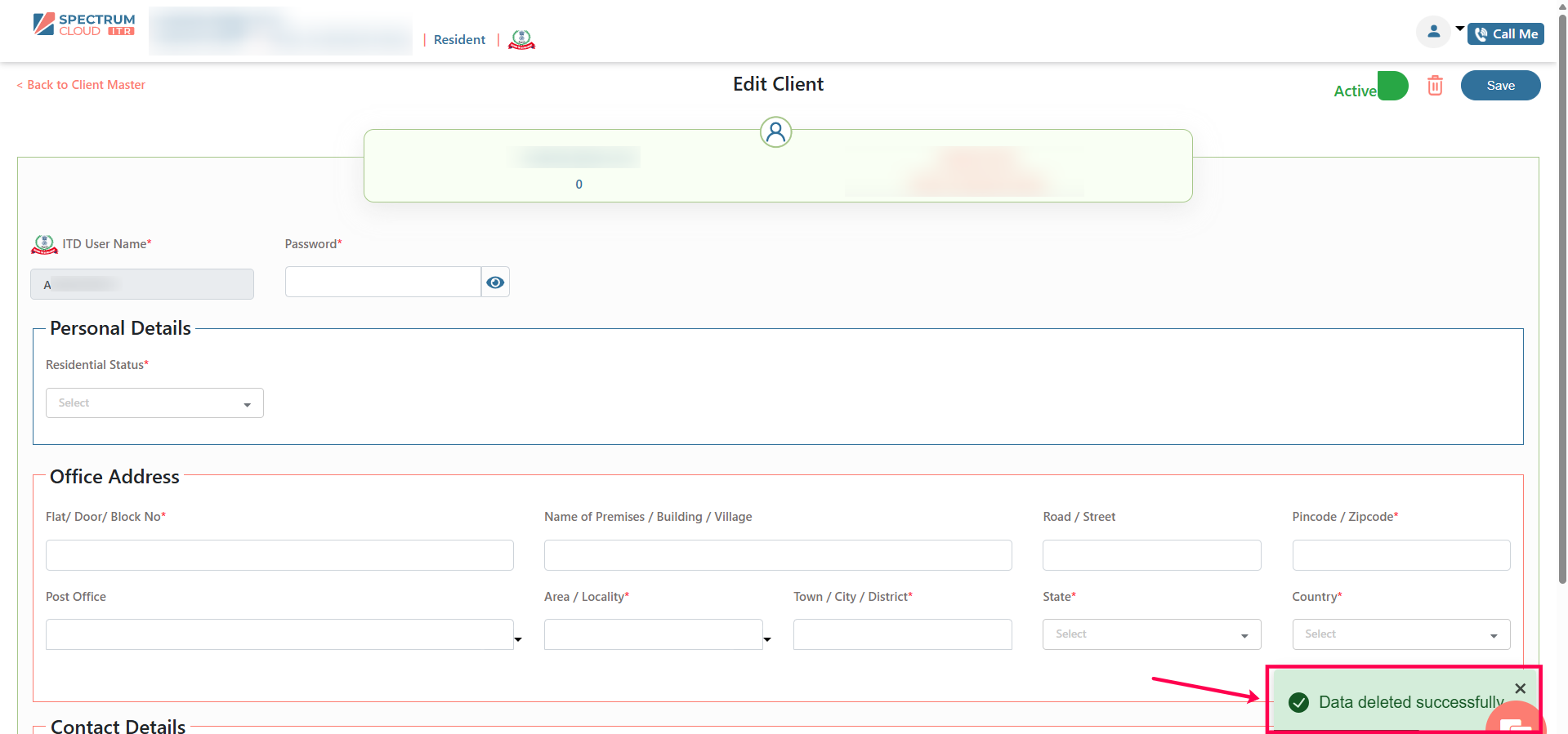 The Client Deletion feature in Express ITR allows users to permanently remove a client from the system. Once deleted, the client will no longer appear in the dashboard, client list, or any other section within the application.