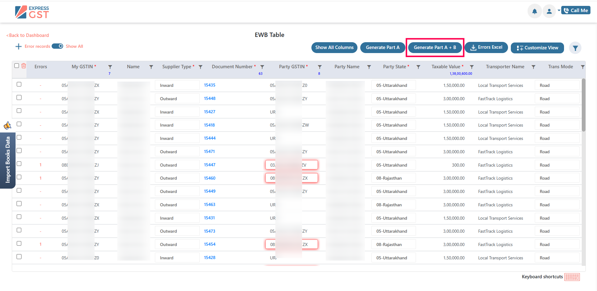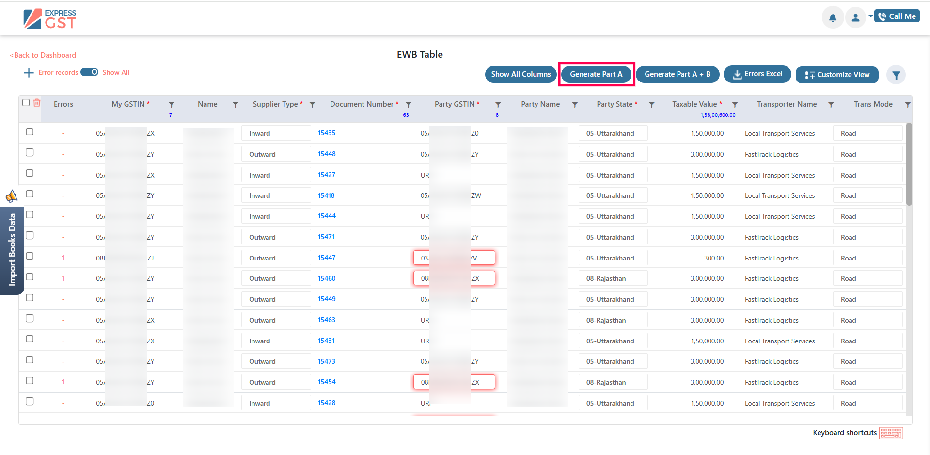 - Select the required records and click Generate Part A or Generate Part A + Part B.