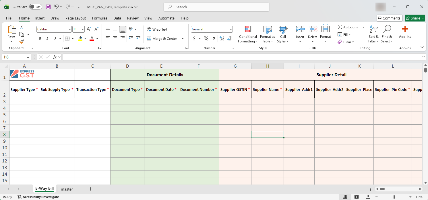 - Open the downloaded template and enter the required E-Way Bill details, including: