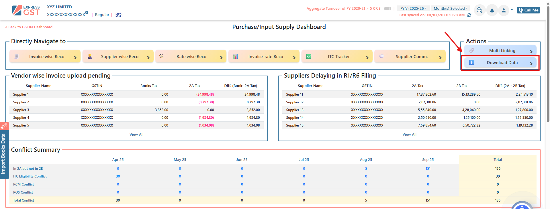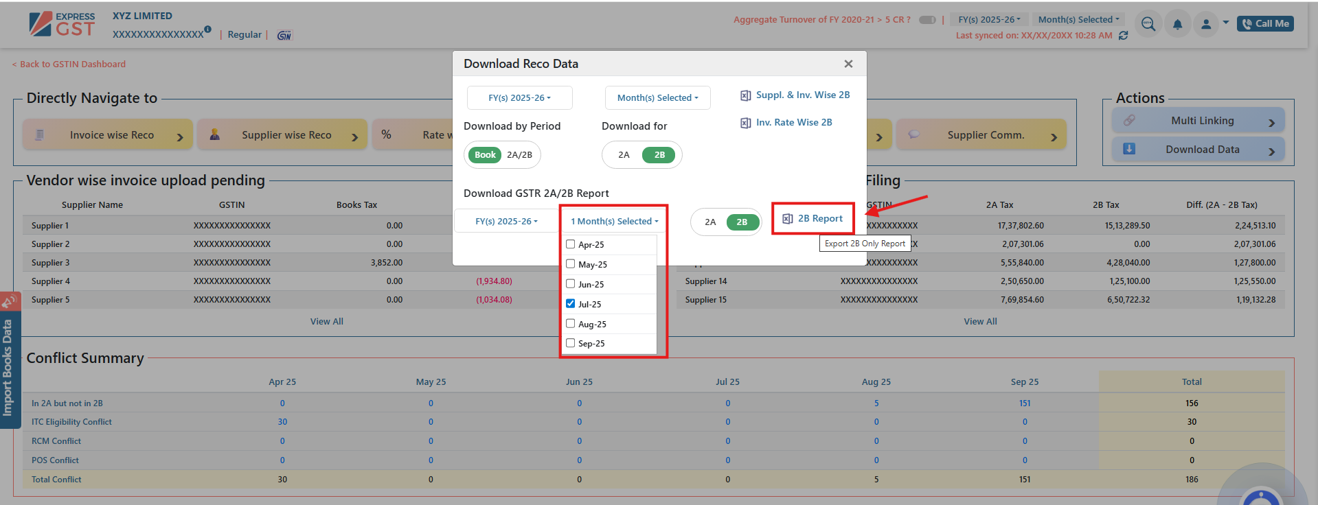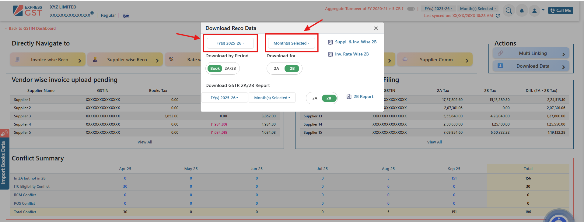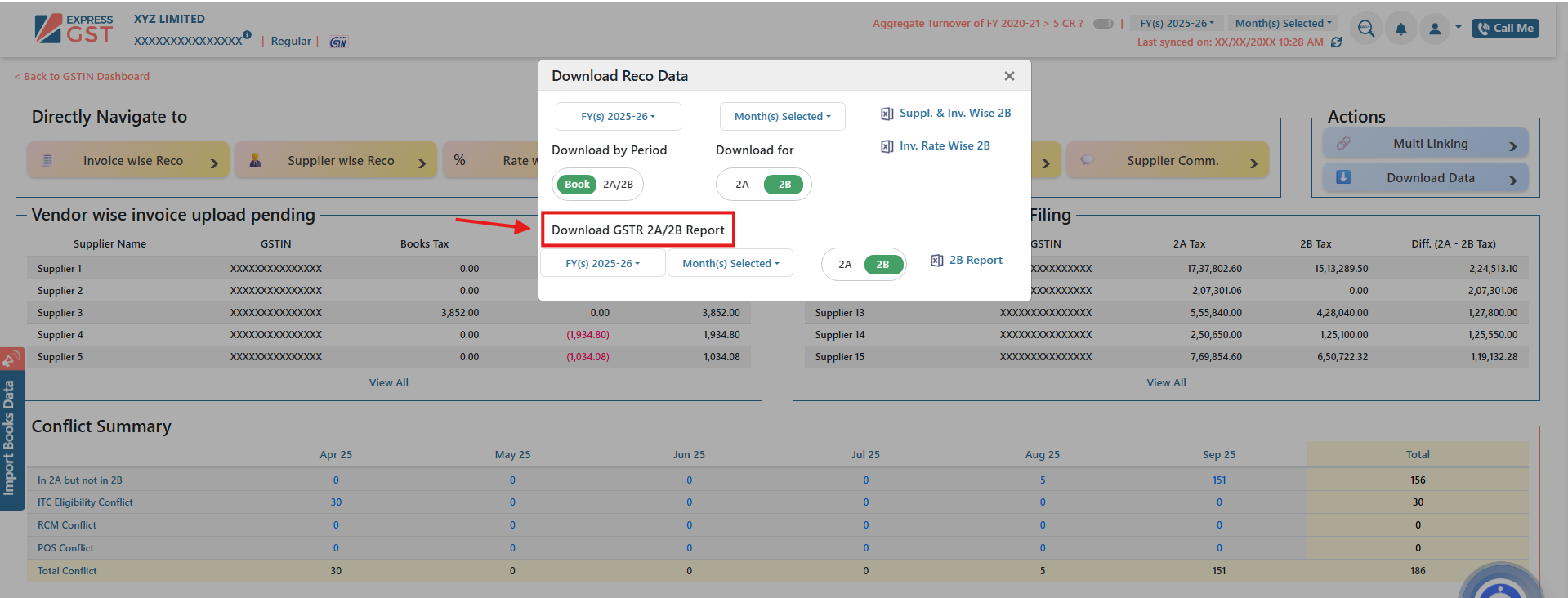 ExpressGST enables users to download GSTR-2A/2B data in Excel format for effective reconciliation and compliance. Data can be extracted either invoice-wise or supplier-wise, and reports are available on both an annual and monthly basis.