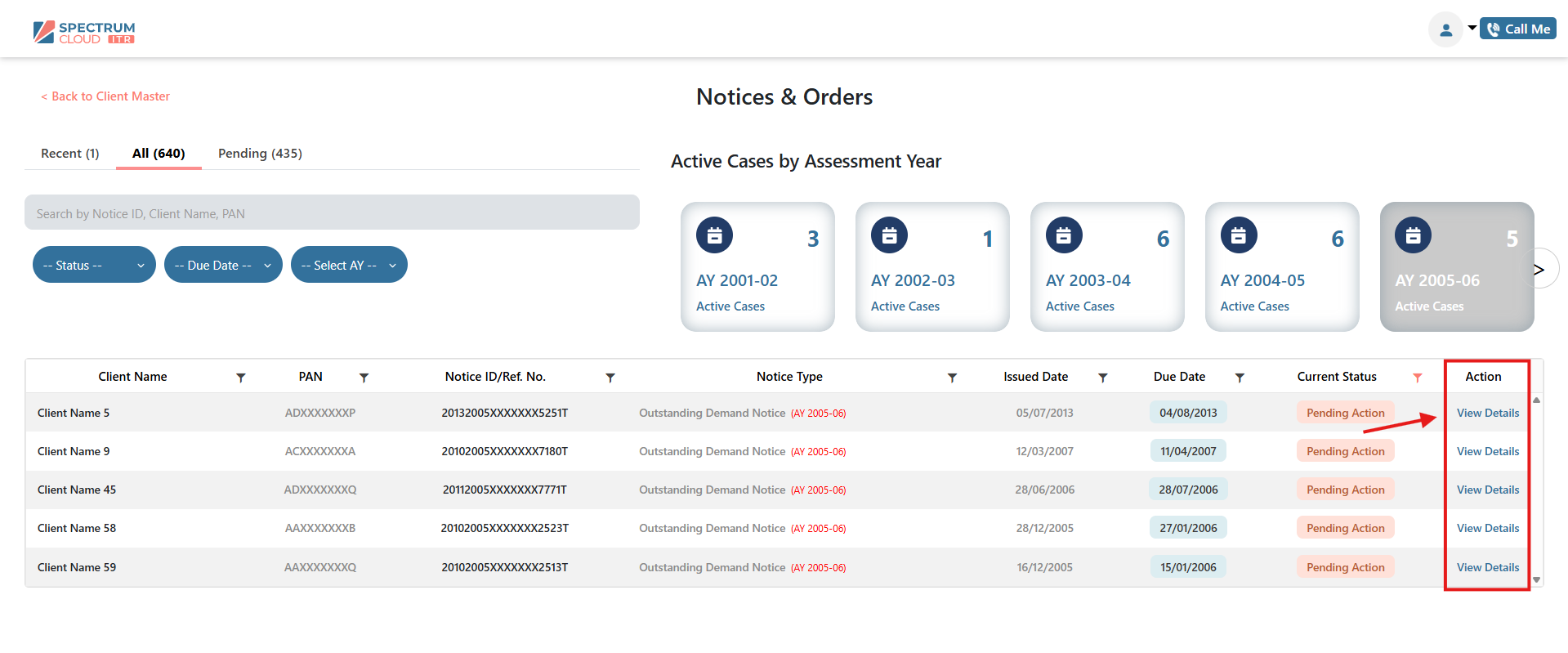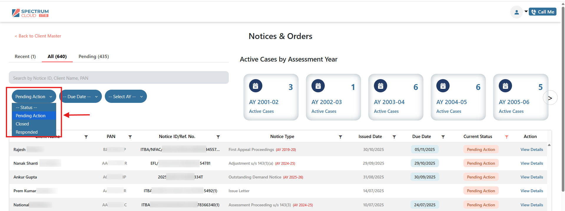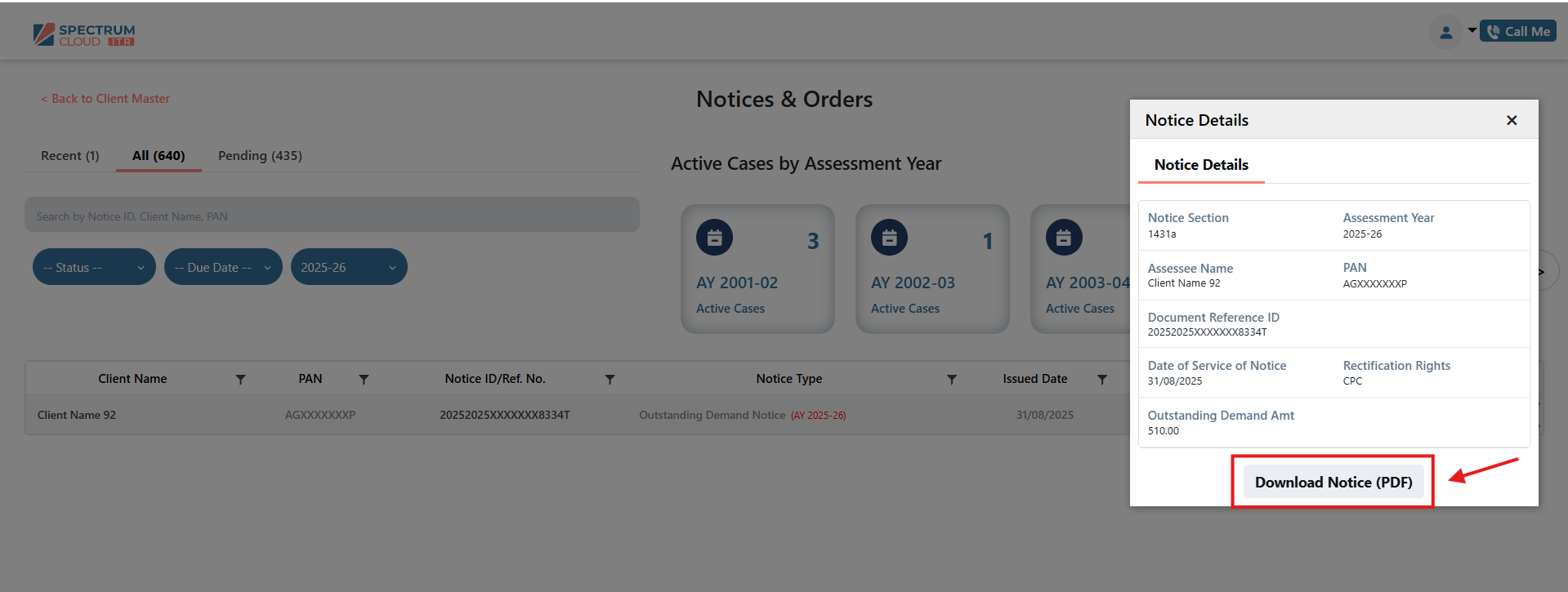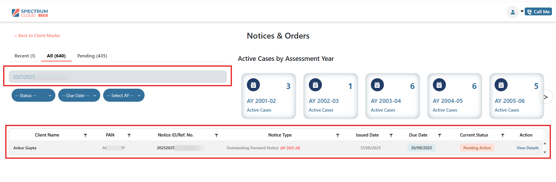 Quickly find a record using the Search Bar by entering a Notice ID, Client Name, or PAN.