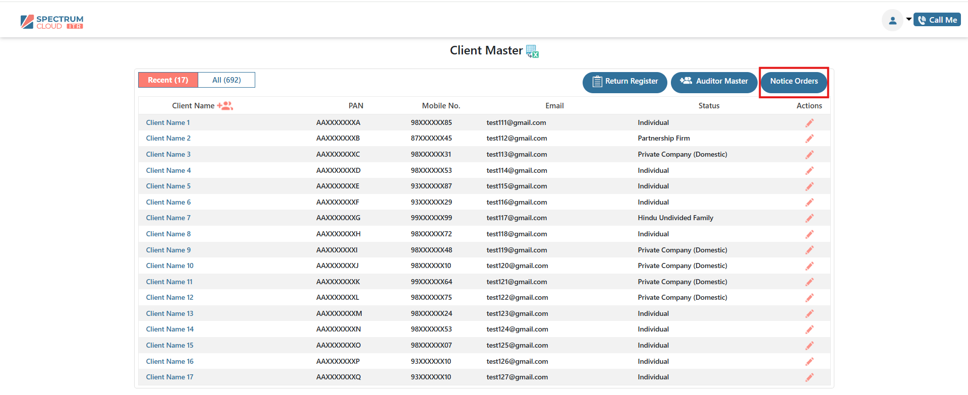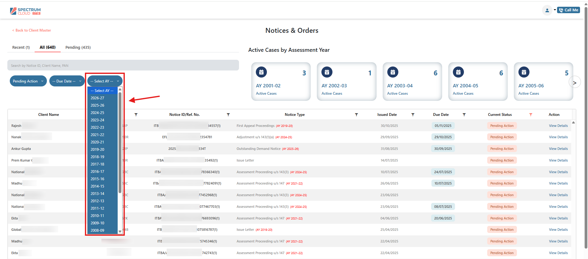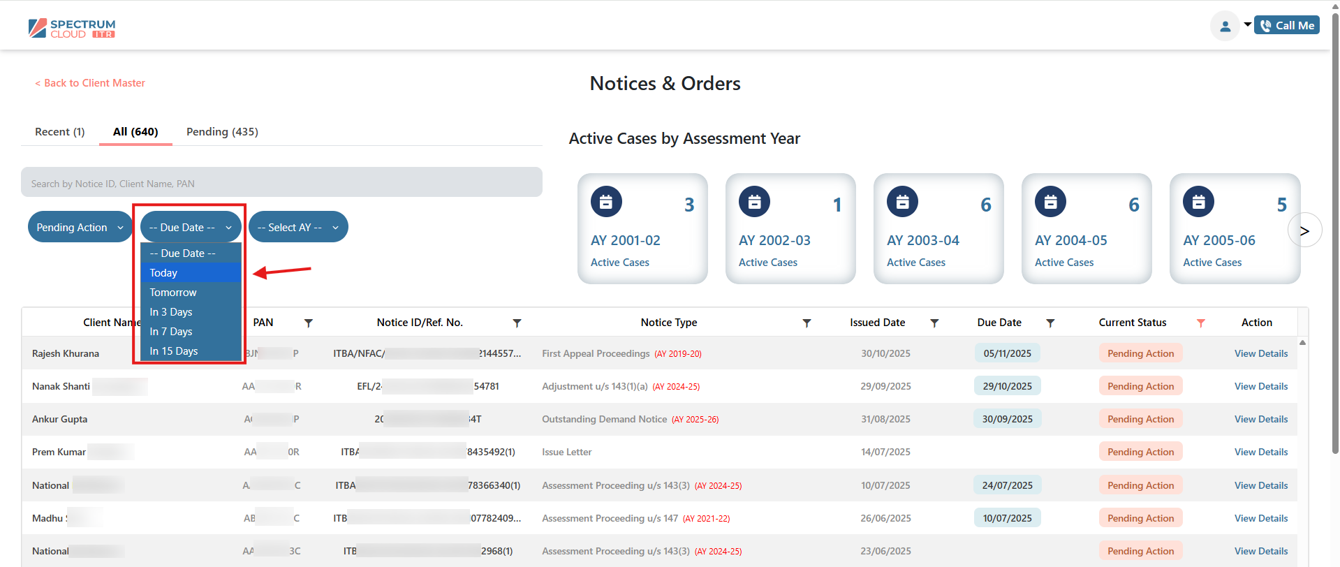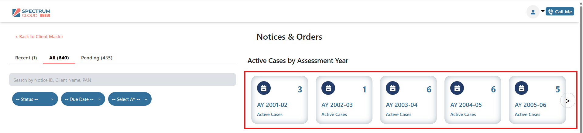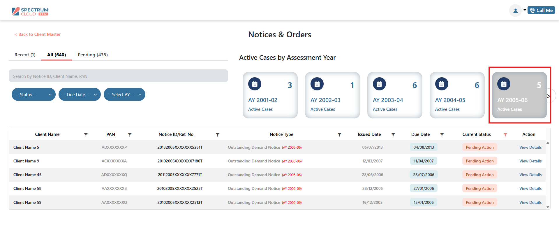 Quickly find a record using the Search Bar by entering a Notice ID, Client Name, or PAN.