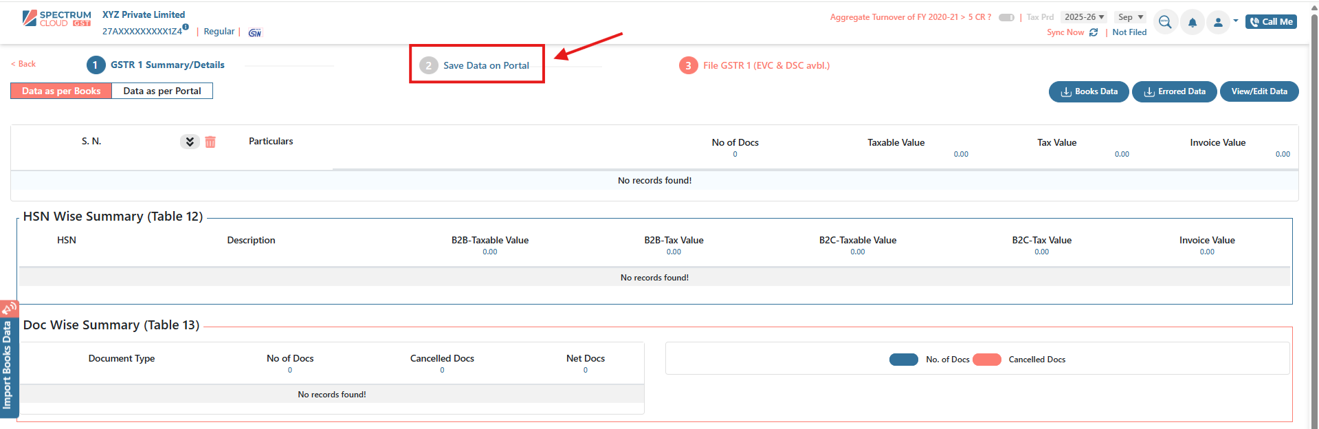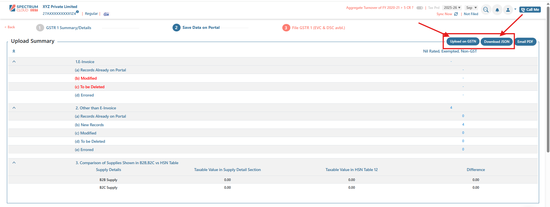 - Click on Save Data on Portal, then press Upload GSTN, OR