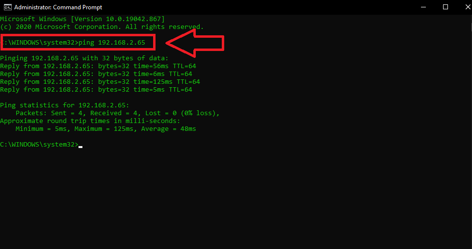 - Once the Command prompt is open, type “ping <ip address of target machine>”.
