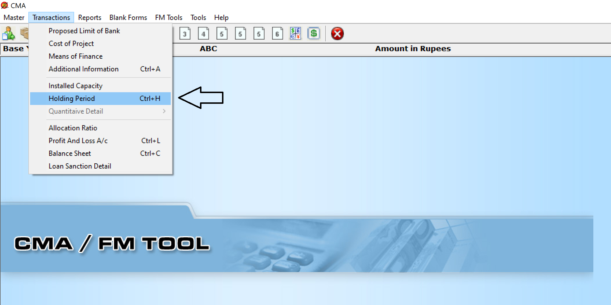 Open the CMA/FM Tools software, go into Transactions → Holding Period option given in menu bar.