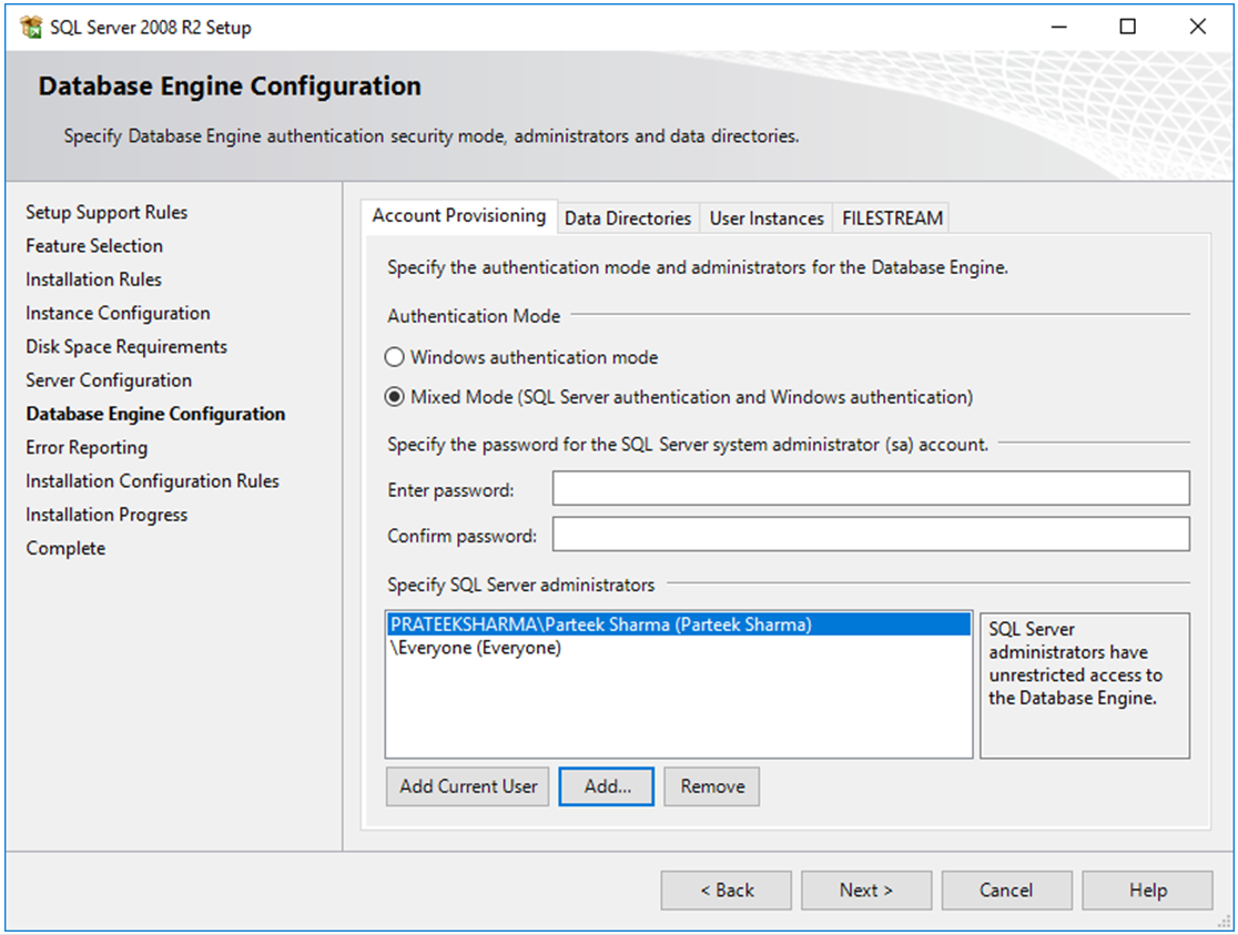 - Click on Mixed Mode (SQL Server authentication and Windows