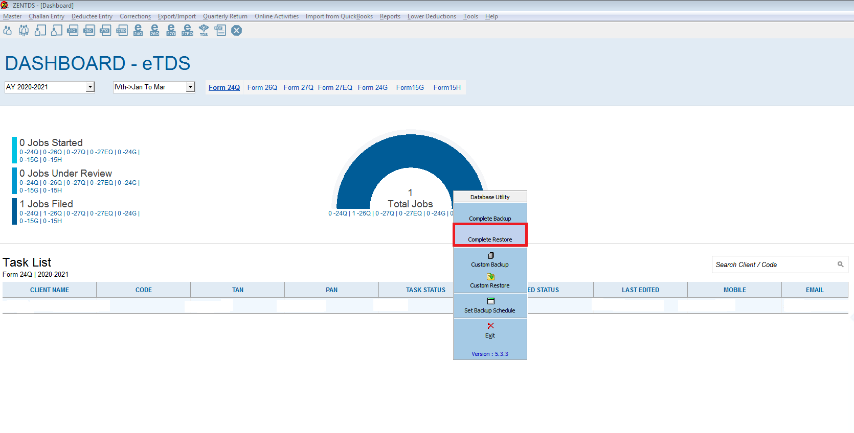 To restore a custom data backup for a specific client, please follow these steps: Open the Spectrum module, such as Income Tax or TDS. Navigate to the "Tools" Menu → "Database Utility" → "Custom Restore". Select the custom data backup file you wish ...