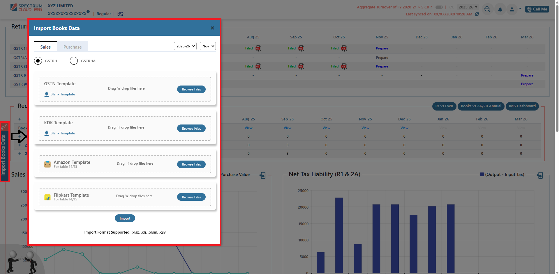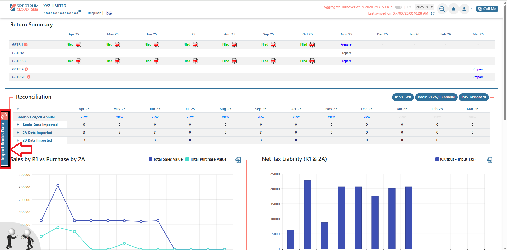 On the Return Summary page, all applicable GSTR return types will be displayed. Locate the Import Books Data option on the left-hand side of the screen and click on it to launch the import wizard.