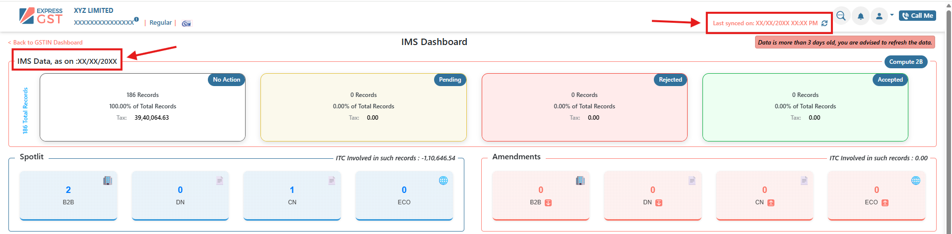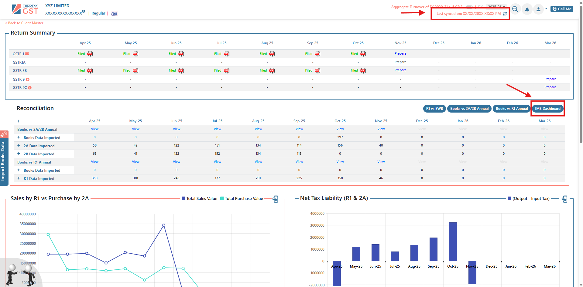 - Next Steps: Click the Sync button to refresh invoice data up to the latest available date. After synchronization, navigate to the Reconciliation section and open the IMS Dashboard to continue with the reconciliation process.