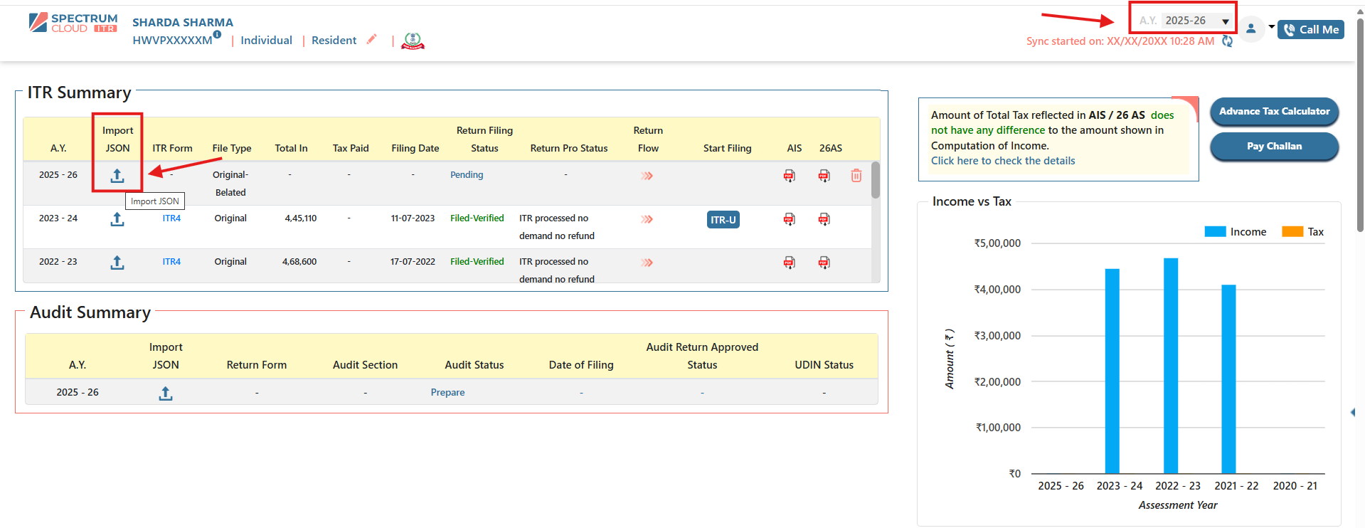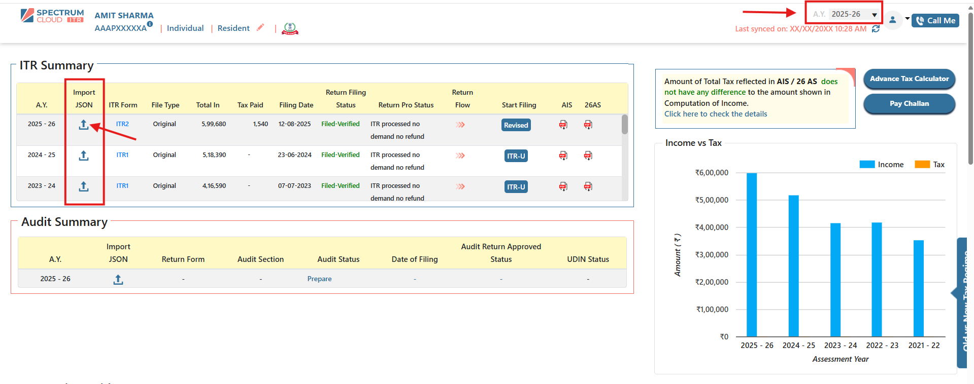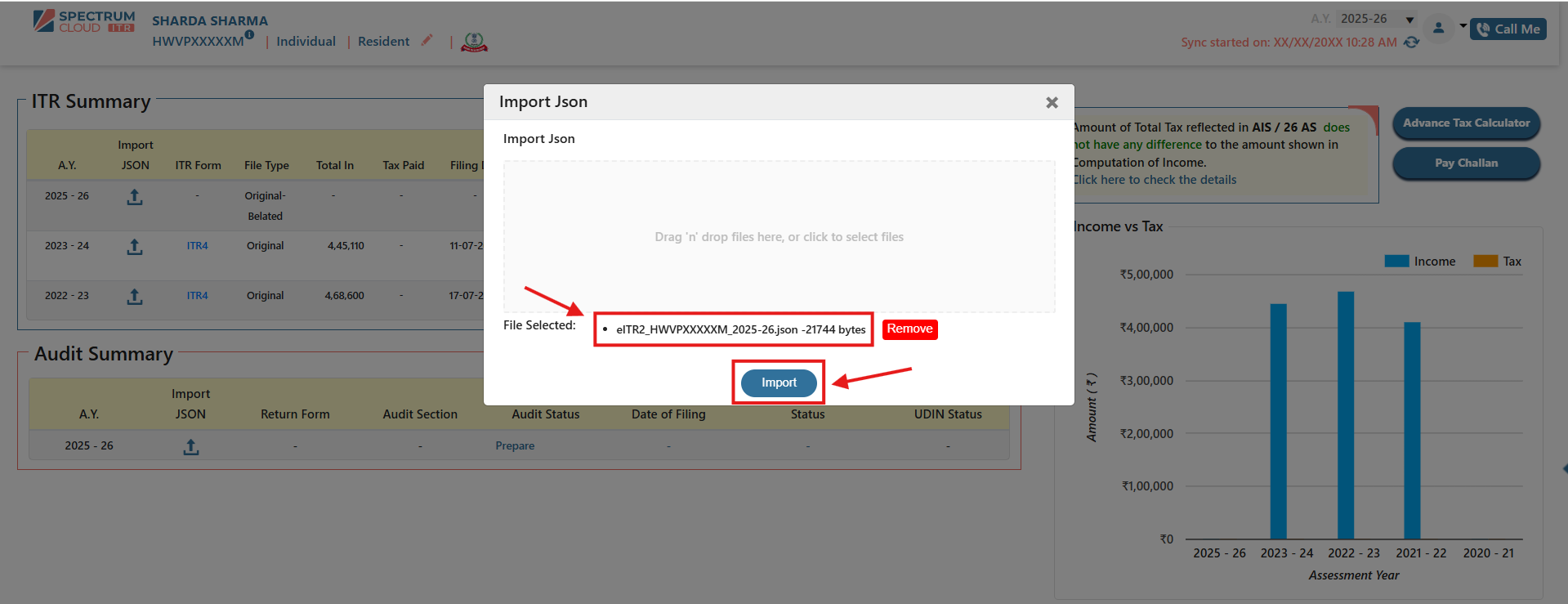 Importing a 3CD JSON File Process To import a 3CD JSON file in Express ITR, follow these steps: Step 1: Open Audit Summary Access the client profile in Express ITR. In the Audit Summary section, click on Import JSON to proceed. Step 2: Import the ...