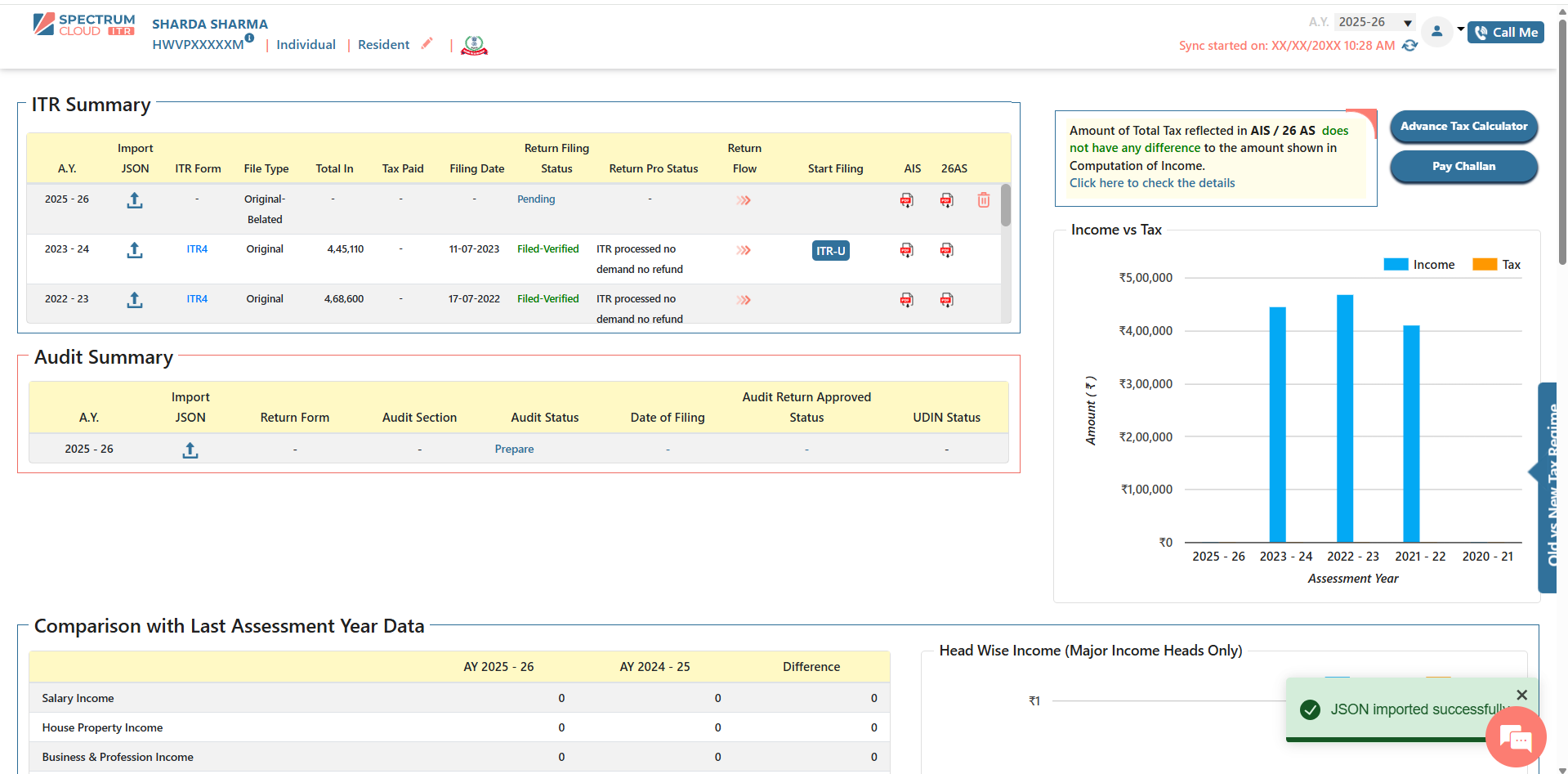 The system will successfully import and populate the JSON data into the client’s ITR workspace.