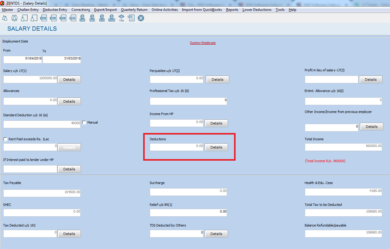 Where can we enter interest on PPF: Solution: Go To Deductee Entry > Salary details > Double Click on Employee > Deduction > 80C: Step 1: Go to Deductee Entry >> Salary Details: Step 2: Select the Particular Employee: Step 3: Click on Deduction: Step ...