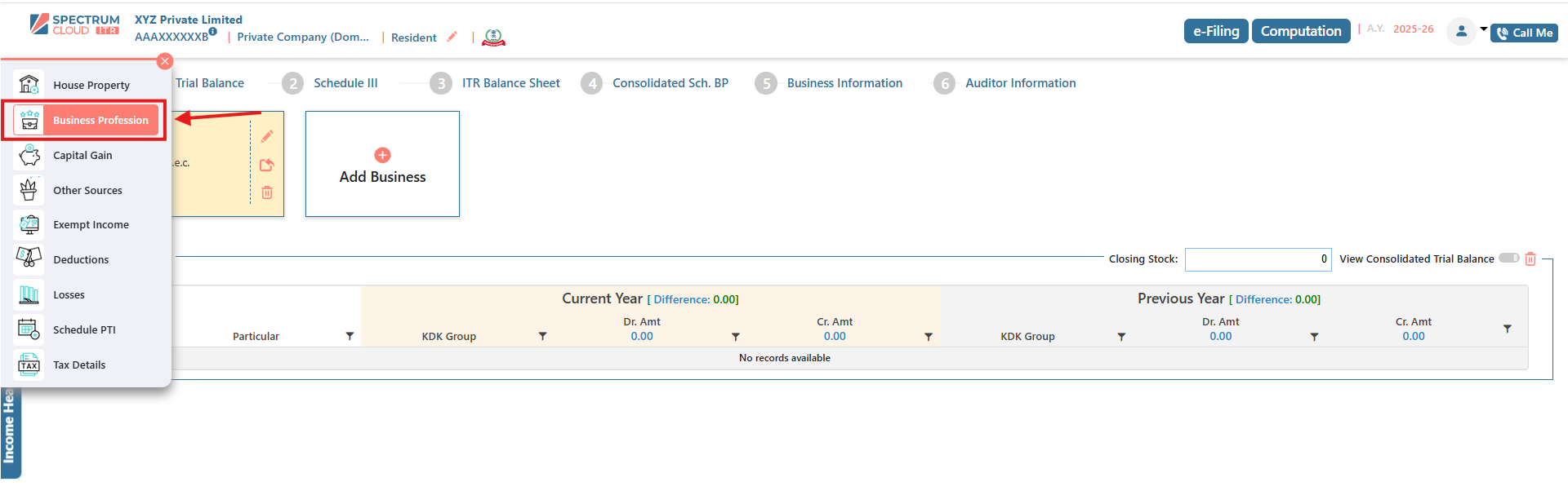 - Within the Business Profession Income section, click on Schedule III.