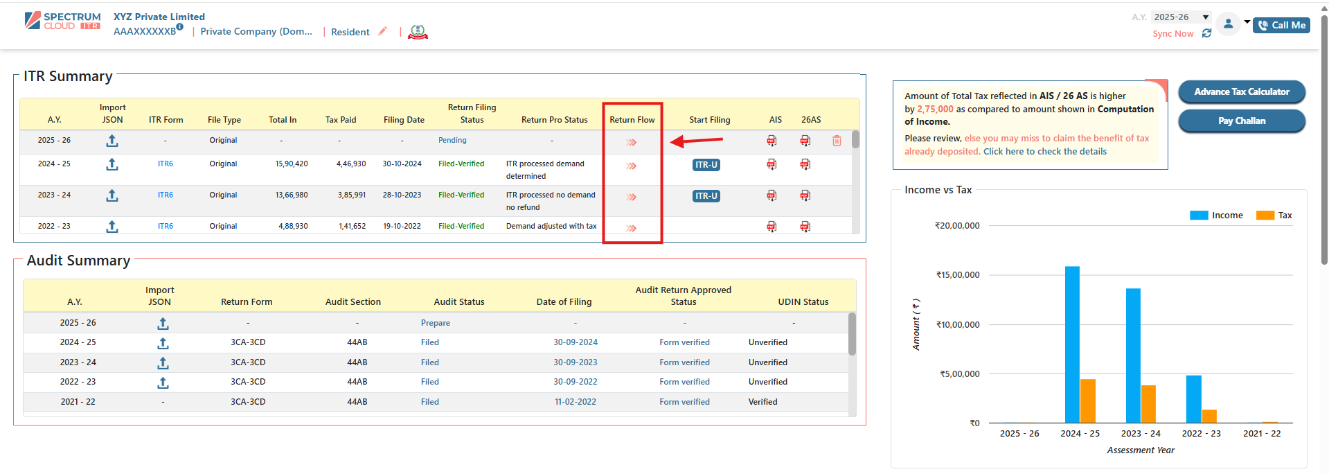 Financial Statements Data Entry Process Step 1: Access the Return Flow Log in to the client’s profile in Express ITR. Navigate to the ITR Summary section and select Return Flow to initiate the process. Step 2: Navigate to the Business Profession Head ...
