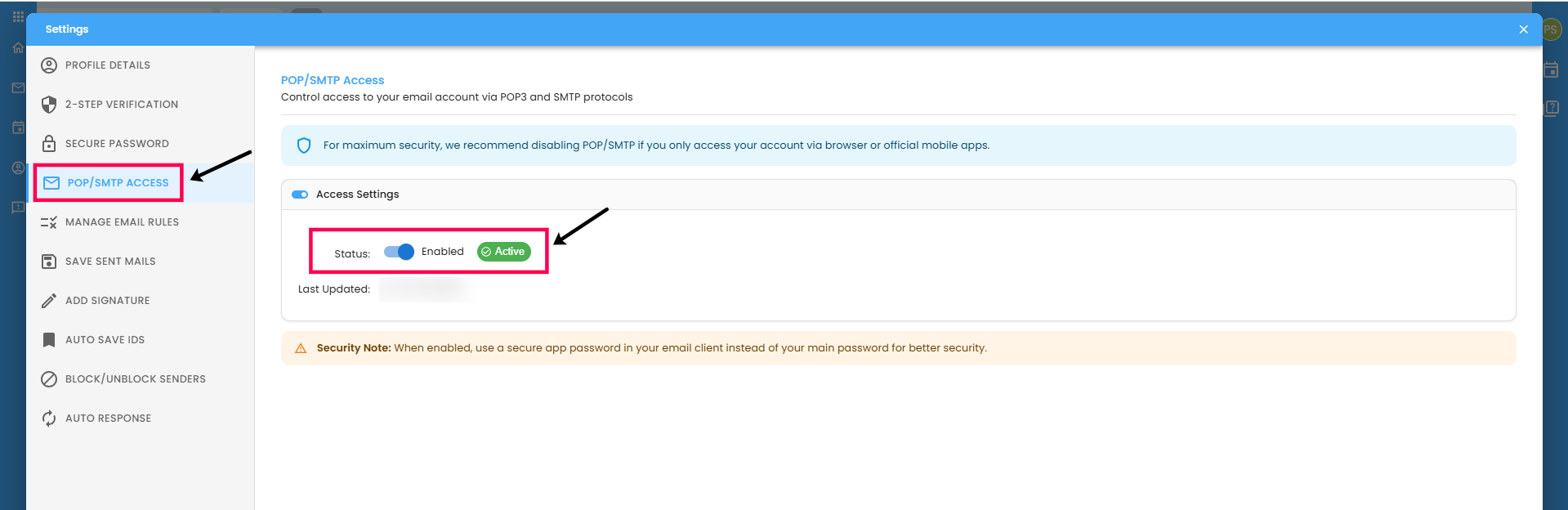 - Within the mail or security settings, ensure that POP / SMTP access is enabled for external applications.