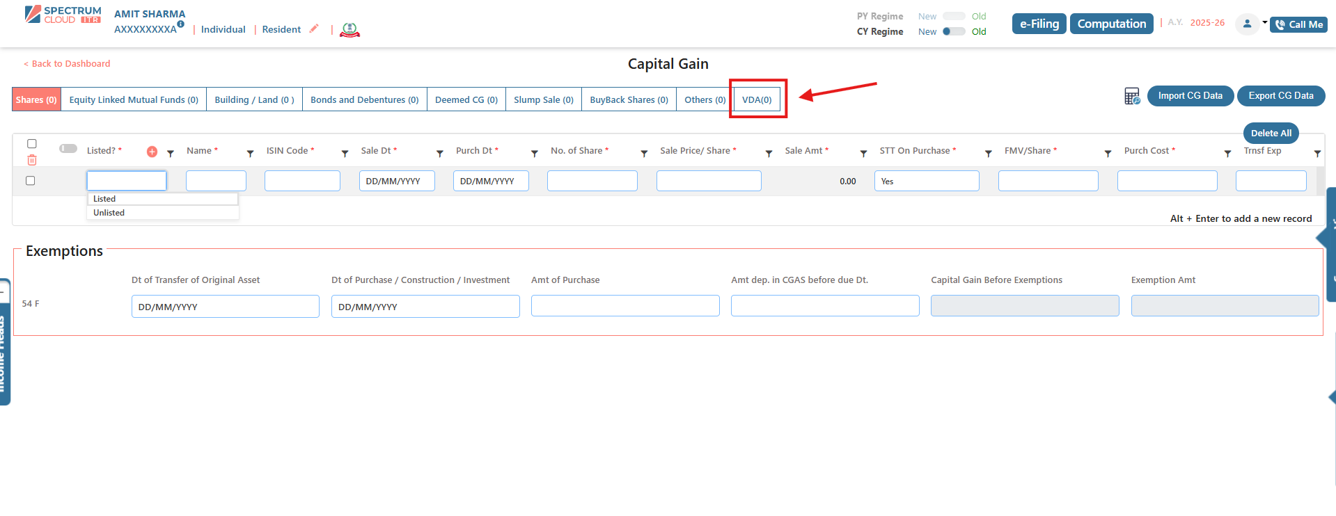 - Select Schedule VDA to begin entering details related to Virtual Digital Assets.