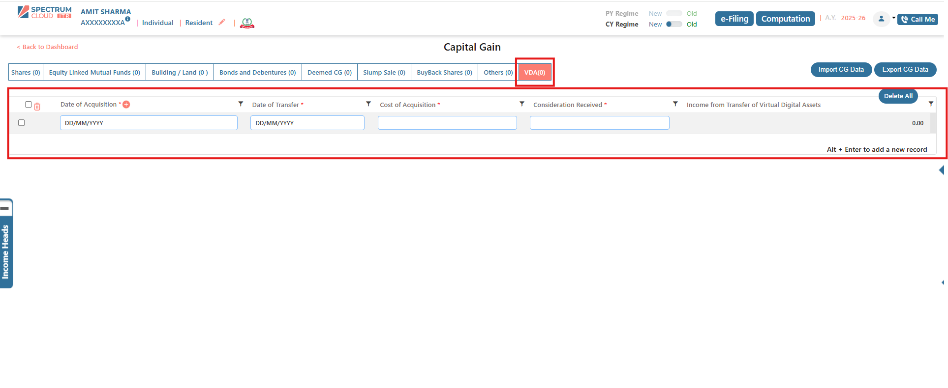 - Income Head: Choose the applicable income head under which the VDA transaction should be taxed.